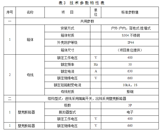 2.3.11在運用中能夠交換的具有同樣額定值和結(jié)構(gòu)的組件,應具有交換性。3標準技術(shù)參數(shù)技術(shù)參數(shù)特性表是對收買設備的基礎(chǔ)技術(shù)參數(shù)要求,供貨方應對技術(shù)參數(shù)特性表中標準參數(shù)值進行呼應。低壓電纜分支箱技術(shù)參數(shù)特性見表3