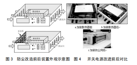 3.2在裝置本體進(jìn)風(fēng)孔加防塵網(wǎng),防止灰塵進(jìn)入裝置內(nèi)部,設(shè)備維護(hù)人員定期對(duì)濾網(wǎng)進(jìn)行清掃,從而減輕元器件表面覆塵,利于裝置正常散熱,如圖3所示加裝防塵網(wǎng)后開(kāi)關(guān)電源示意圖。對(duì)裝置實(shí)施上述改進(jìn)后,其改進(jìn)前后對(duì)比如圖4所示。