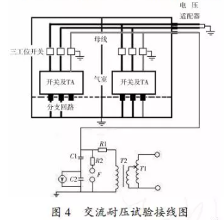 本次試驗對母線進行交流耐壓試驗,按圖4進行試驗接線,加壓端口在4×15避雷器電纜插口處。
