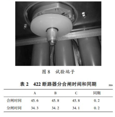 本次試驗選取422斷路器進行機械特性測試,按圖6進行試驗接線。將4221隔離開關(guān)置于接地位置,將試驗端子接到柜內(nèi)電纜接口,然后將試驗線接到試驗端子下端進行試驗。試驗端子如圖8所示。422斷路器分合閘時間和同期見表2。