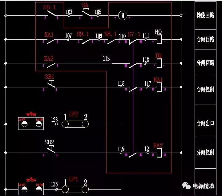所以在該圖上按下合閘按鈕SB1,首先繼電器KA1會得電吸合,吸合后合閘回路KA1常開觸點會變常閉狀態(tài),如果確認(rèn)下門已關(guān)好,隔離開關(guān)處于合閘狀態(tài),接地開關(guān)處于分閘狀態(tài),電機已儲能。此時合閘線圈得電工作,觸動開關(guān)合閘機構(gòu)位置,開關(guān)合閘。所以我們在合不上閘的情況下,首先要判斷所有的輔助觸點狀態(tài)(即接地開關(guān)狀態(tài)、隔離開關(guān)狀態(tài)、電機儲能狀態(tài)、下門關(guān)閉狀態(tài))由硬件設(shè)施到回去狀態(tài)去解決,相必會事半功倍。