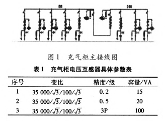 變電站位于高原地區(qū),海拔2100m。變電站選用某公司生產(chǎn)的35kV中壓氣體絕緣開(kāi)關(guān)設(shè)備。主接線(xiàn)如圖1所示,其中電壓互感器型號(hào)為JDZx-35(A、B、C)型,具體參數(shù)如表1。
