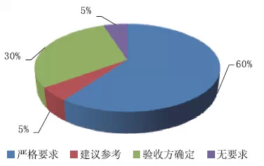 針對參加者所接觸到的項目,圍繞是否對固體絕緣環(huán)網(wǎng)柜產(chǎn)品的功能有嚴(yán)格要求與否,以為有嚴(yán)格要求的占比60%;主張參閱的占比5%;驗(yàn)收方確認(rèn)的占比30%;無要求的占比5%。如圖5所示。