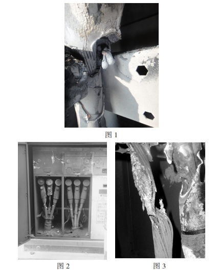 2009年2月15日,回南天,仙村站孔堂線在經(jīng)歷了長達18分鐘的間歇性接地后速斷跳閘,重合不成功,K5013-0003X電纜分支箱601開關(guān)B相進線電纜終端應力錐處首要短路燒毀(如圖2)。據(jù)分支箱鄰近商鋪店主反映,箱內(nèi)曾持續(xù)宣布嘩啪的響聲并冒煙,畢竟傳出爆炸聲音。經(jīng)開端剖析,事端原發(fā)點為B相應力錐尾部,由于密封不嚴,硅脂固化,在工作環(huán)境濕度較大的情況下出現(xiàn)凝露,水氣進入纜芯,導致絕緣強度損壞發(fā)生爬電。畢竟由間歇性接地發(fā)展到三相短路(如圖3)。此次故障相同導致分支箱氣室破損走漏,分支箱作廢。