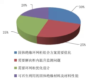 在固體絕緣環(huán)網(wǎng)柜規(guī)劃中,認(rèn)為亟待處理的問題具體有以下內(nèi)容,認(rèn)為固體絕緣環(huán)網(wǎng)柜組合方案需求優(yōu)化的占比30%;需求處理柜內(nèi)溫升監(jiān)測問題的占比25%;需求環(huán)網(wǎng)柜優(yōu)化規(guī)劃的占比25%;可再生利用的固體絕緣材料及材料功用的占比20%。如圖10所示。