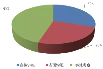 經(jīng)過了解參與者了解新產(chǎn)品知識的途徑,認(rèn)為最有用的辦法中:宣揚(yáng)講座的占比30%;可以經(jīng)過當(dāng)面交流的占比25%;可以參與實(shí)地考察的占比45%。如圖16所示。