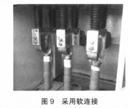 (2)穿墻套管下部與電纜銅搭子導(dǎo)體部分聯(lián)接選用軟聯(lián)接過渡,如圖9所示,可以去除硬聯(lián)接發(fā)生的應(yīng)力,一起消除電纜通電后發(fā)生的電動(dòng)力,隔絕了對穿墻套管的應(yīng)力作用。